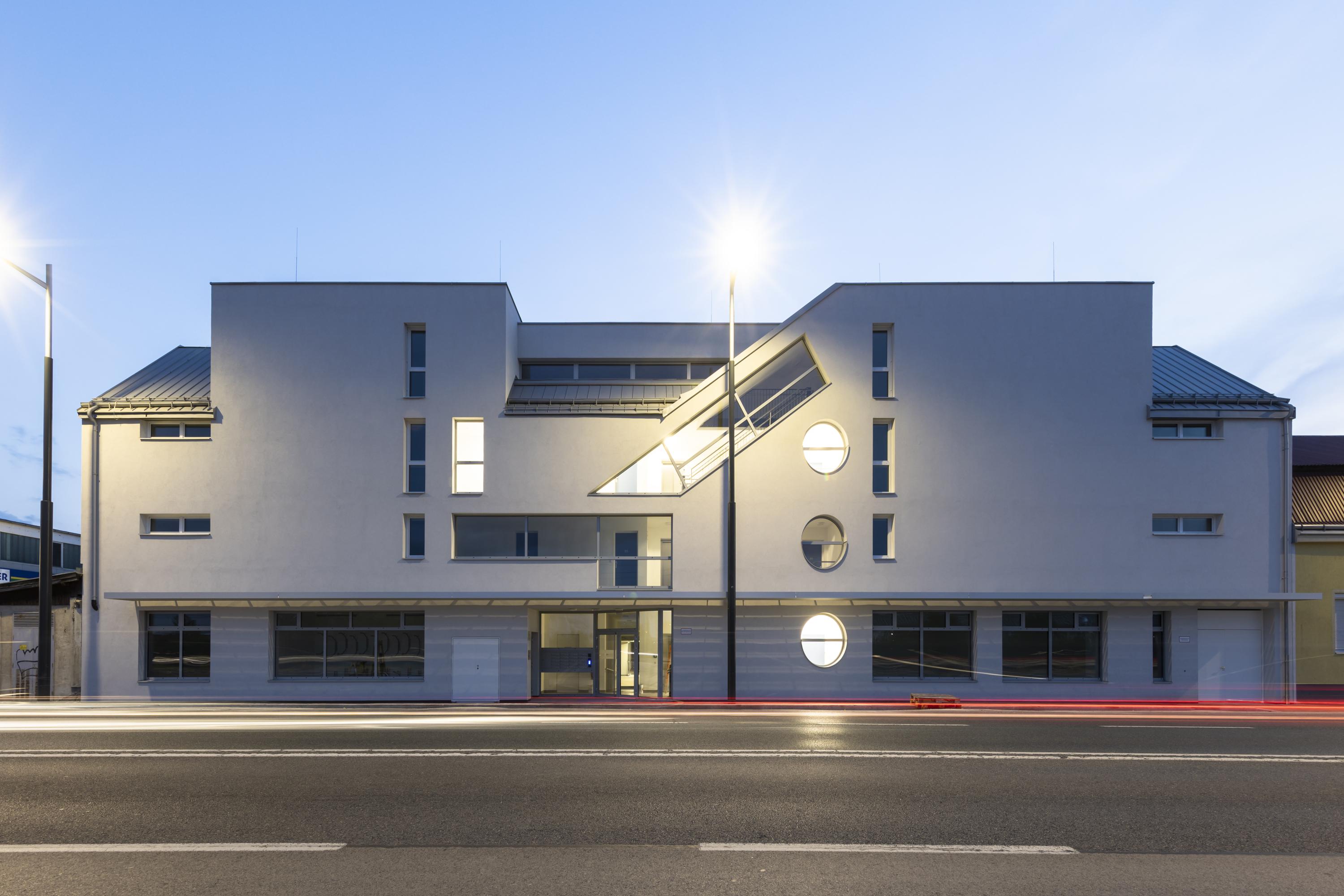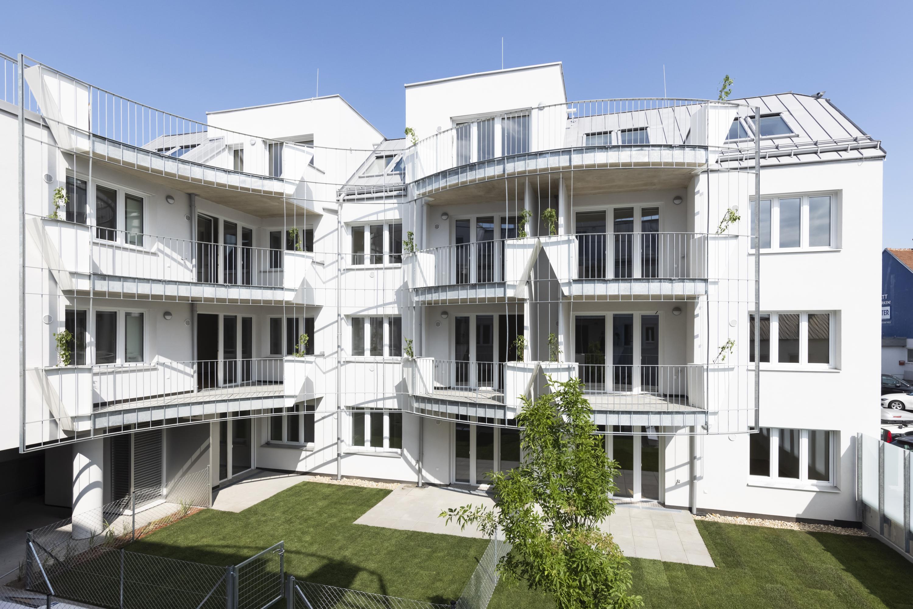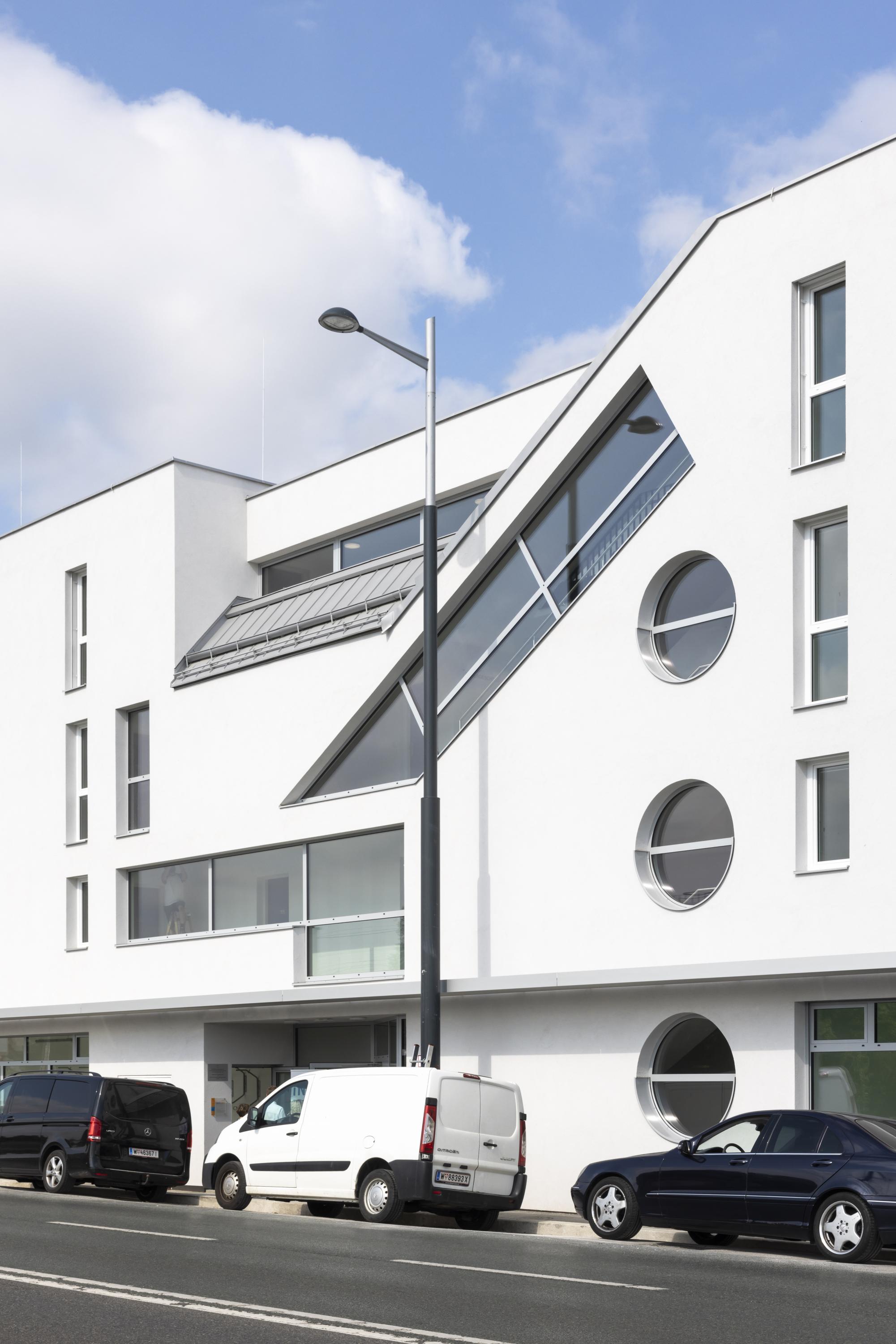 In the main façade facing Triesterstrasse, the natural lighting of the stairwells, combined with the windows of the ground floor zone and the subordinate windows to the bathrooms and vestibules of the apartments, is graphically resolved; a narrow shading element is installed above the sidewalk and the main entrance is emphasized by a niche.
