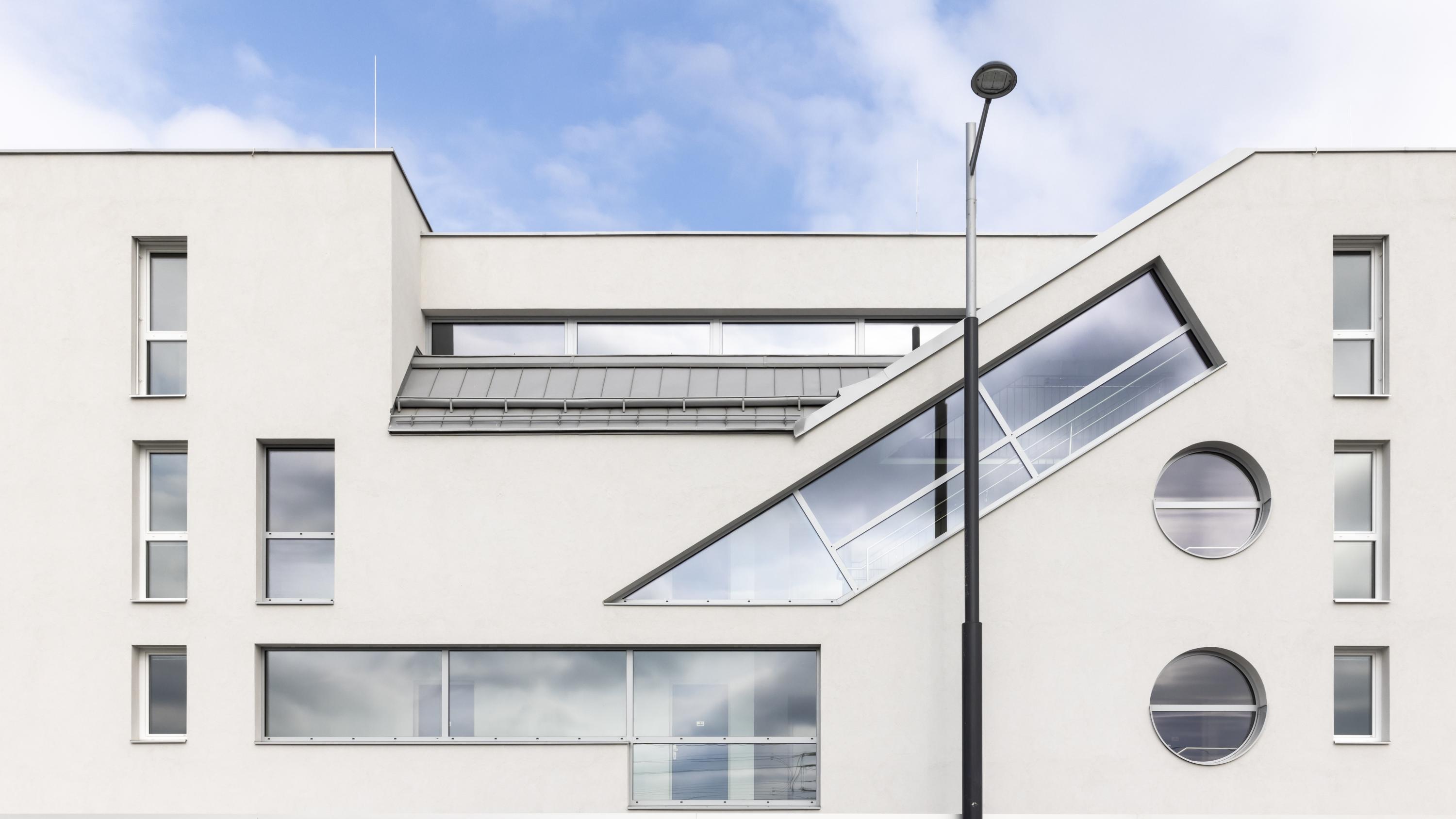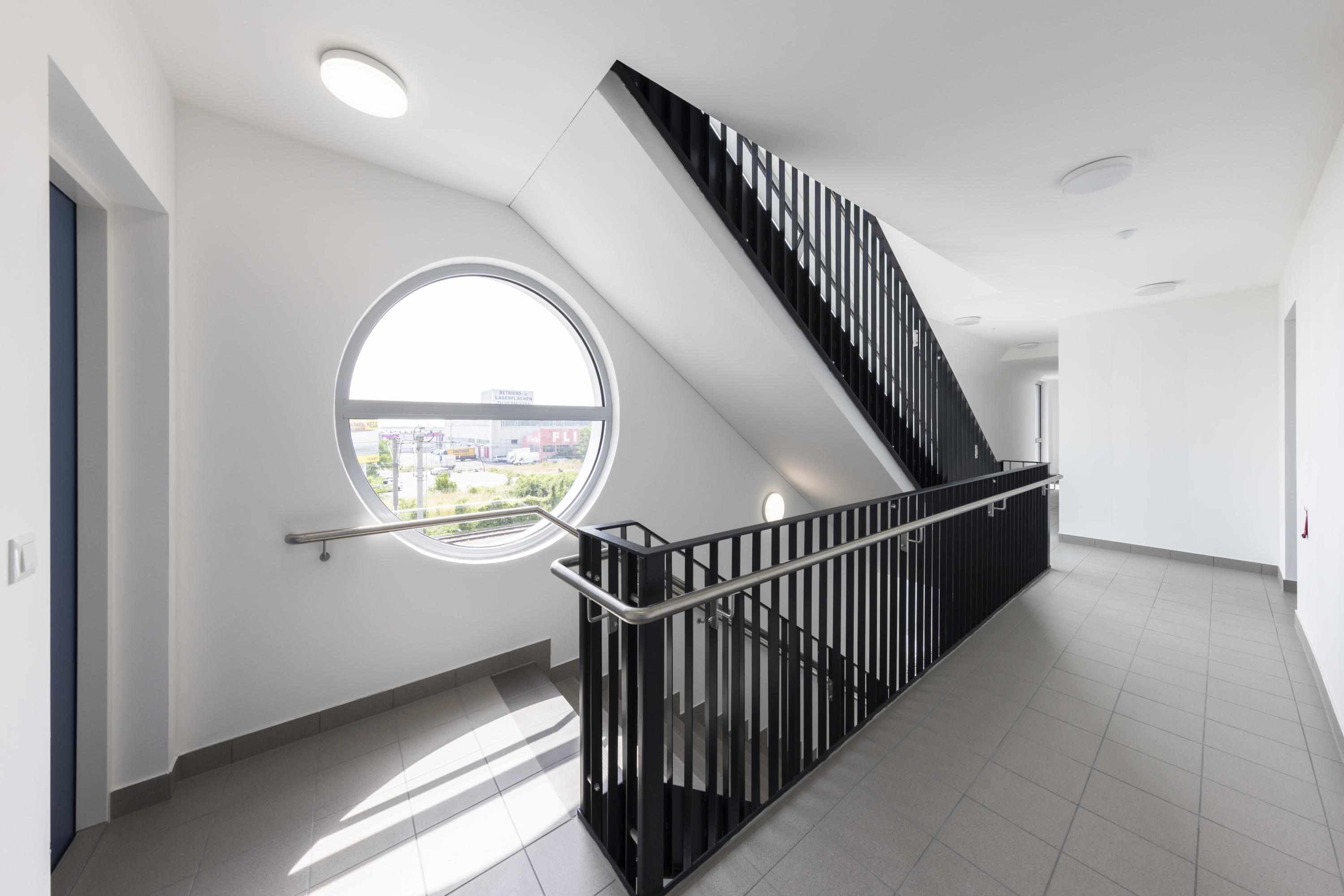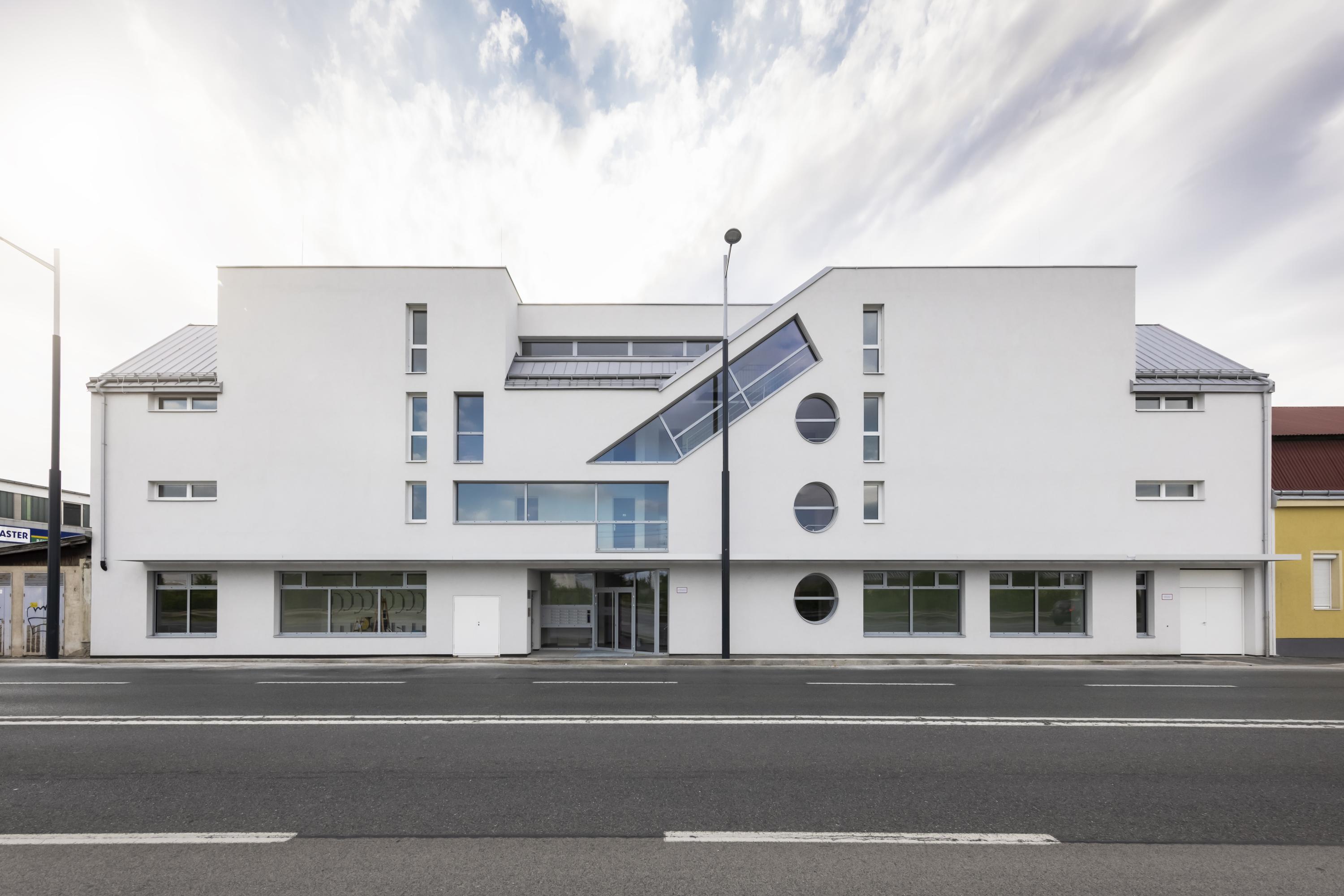 In the main façade facing Triesterstrasse, the natural lighting of the stairwells, combined with the windows of the ground floor zone and the subordinate windows to the bathrooms and vestibules of the apartments, is graphically resolved; a narrow shading element is installed above the sidewalk and the main entrance is emphasized by a niche.