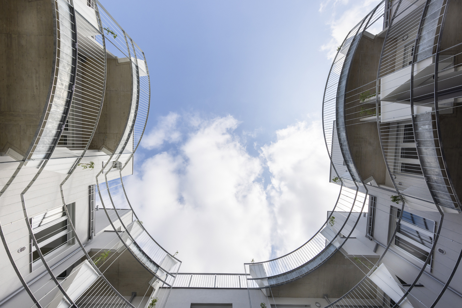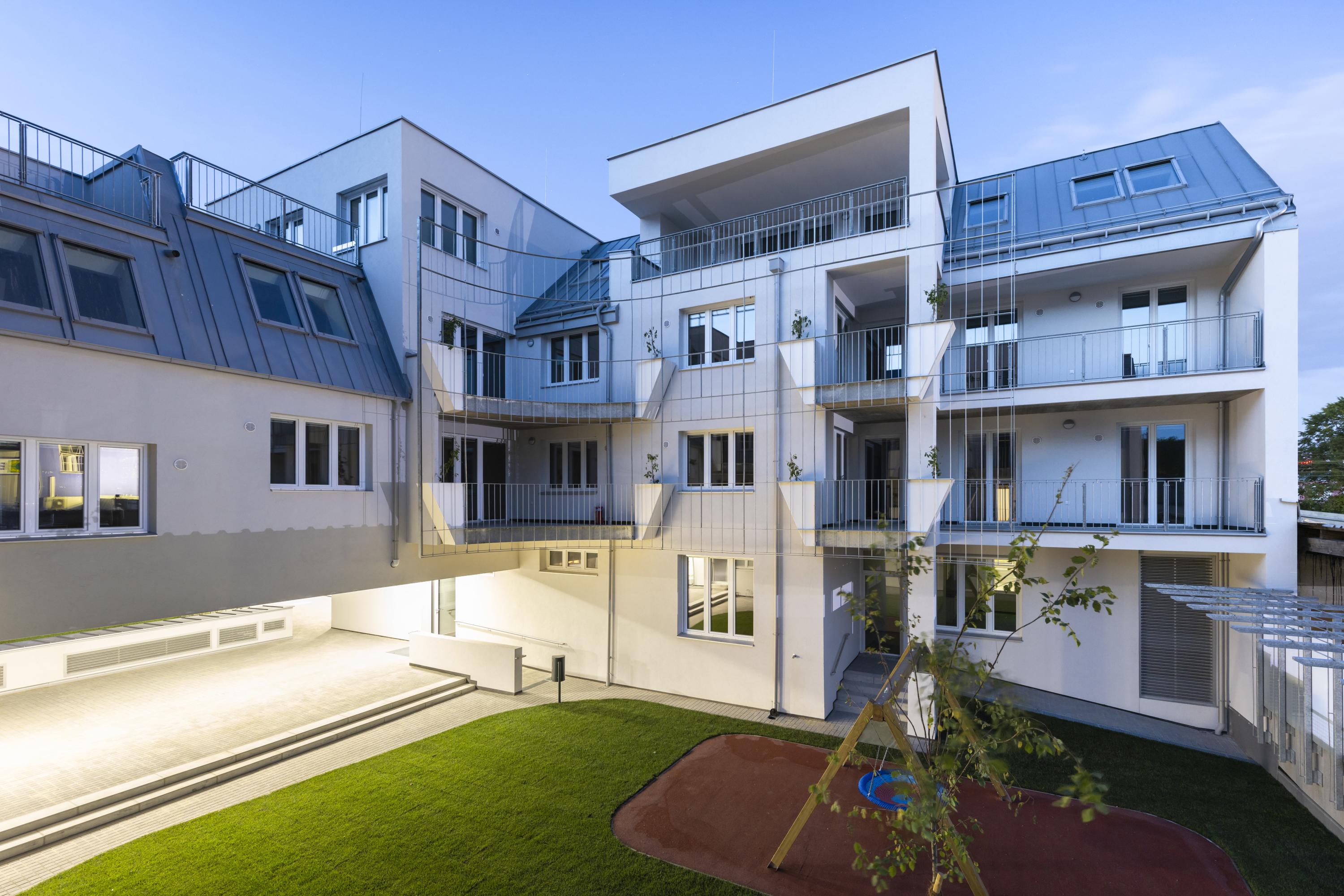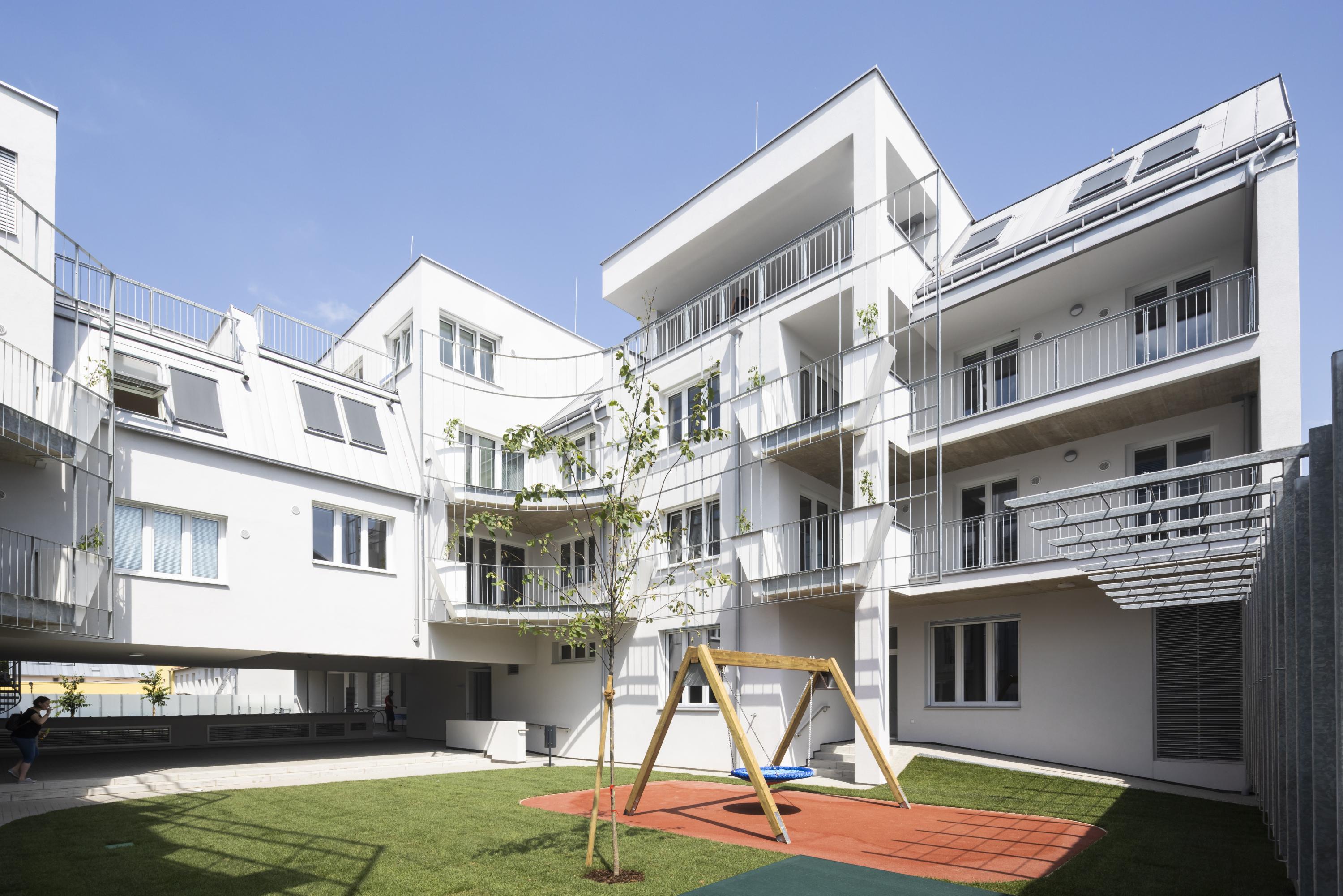 A “green interiority” is developed in the courtyards, which creates an independent ambience for the apartments, isolated from the unattractive surroundings. Green “screens” provide shade in summer but allow the sunshine to come through in winter. The planting of the courtyards and the espalier-like structure for climbing plants give the courtyards their character and create individuality, which is further enhanced by the shape of the loggias and balconies.